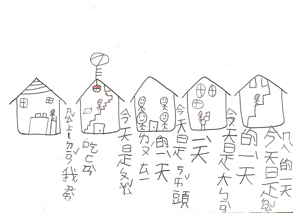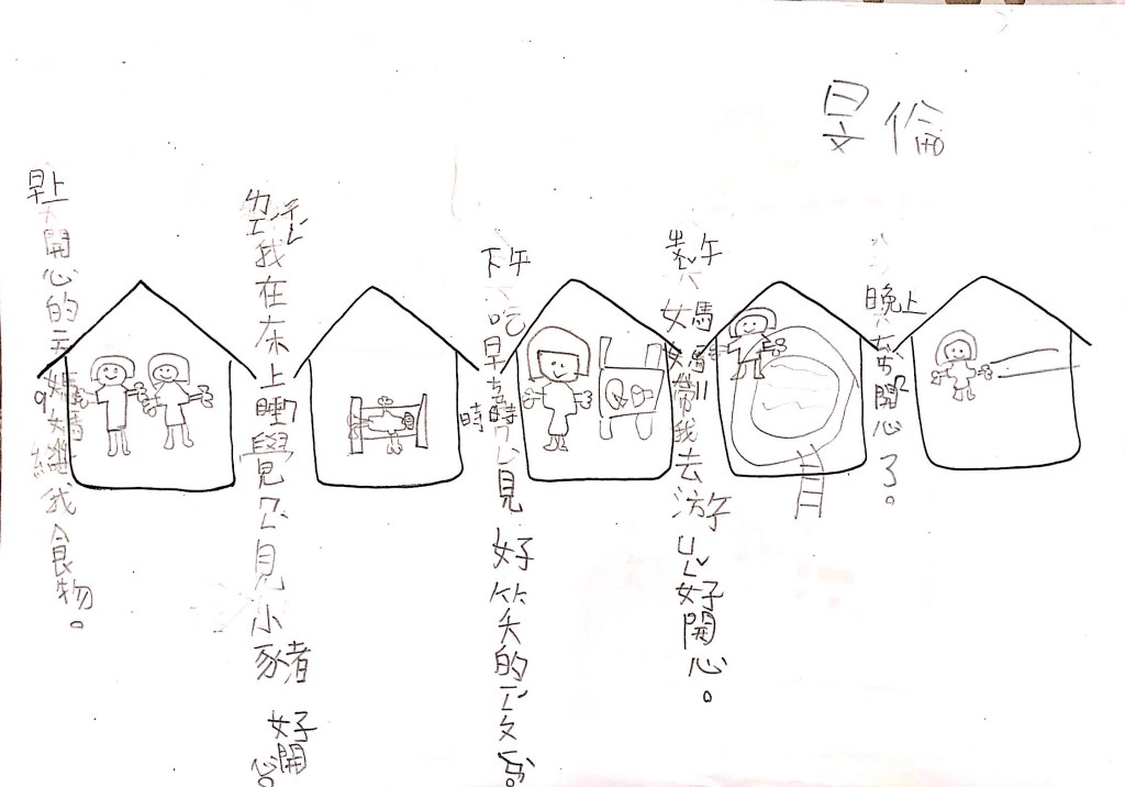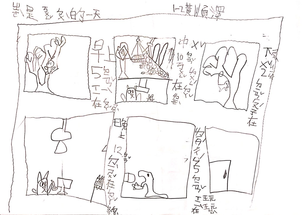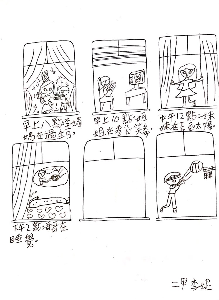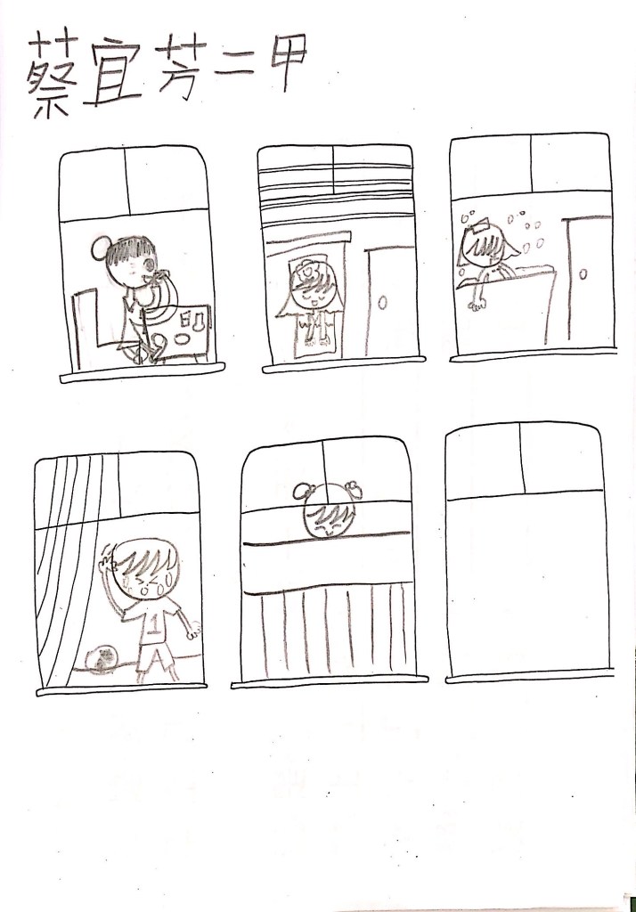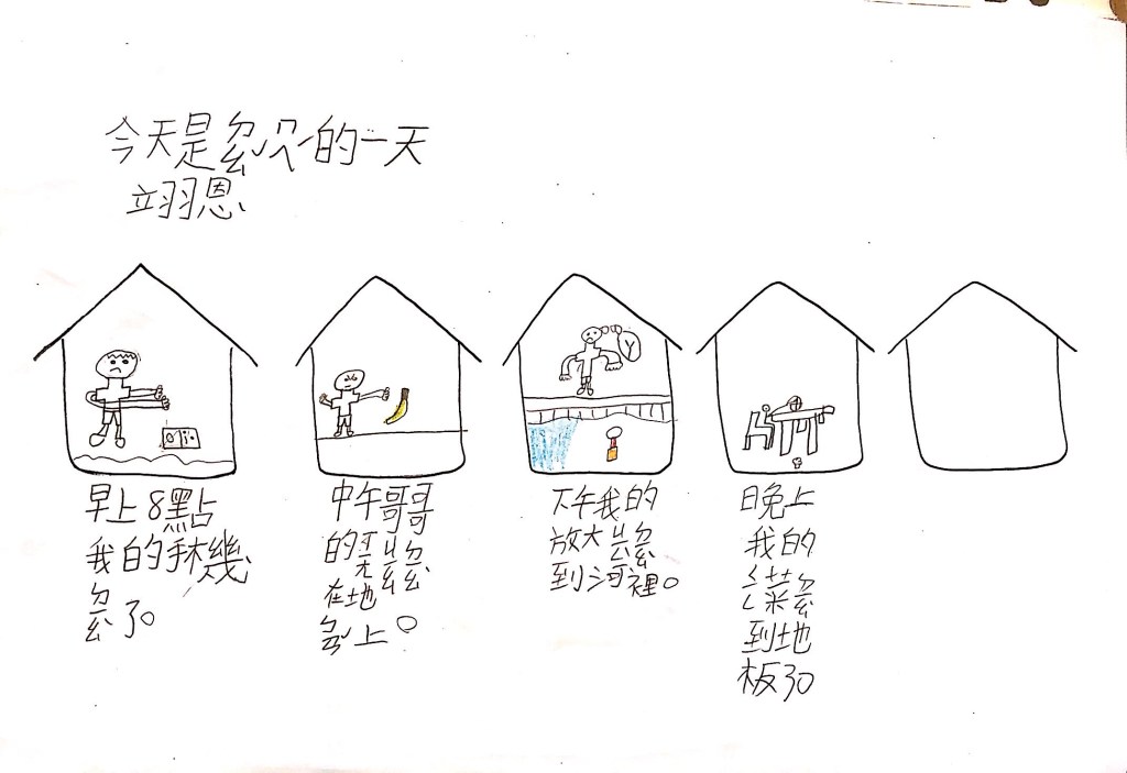 最後透過四扇、五扇、六扇窗,搭配簡單的句子,讓孩子以「這是OO的一天」為題,畫出安靜、生氣、辛苦、倒楣、快樂等情境。