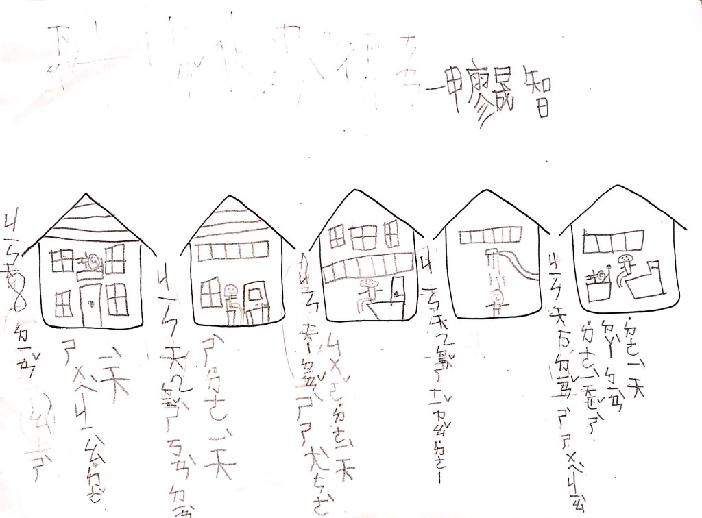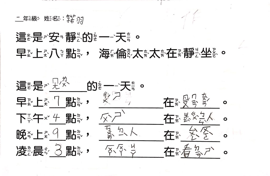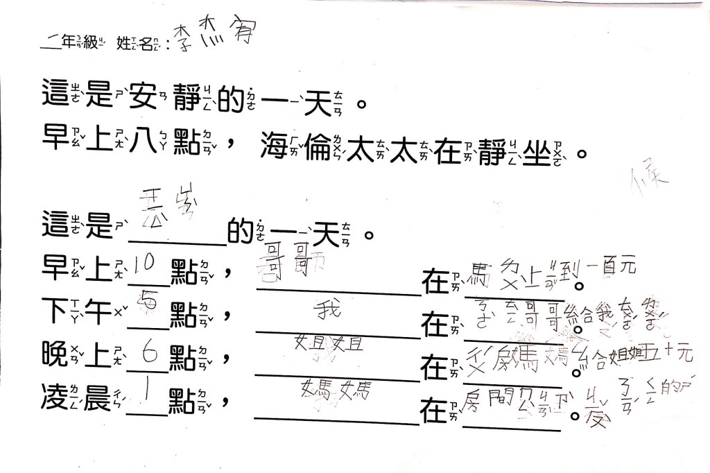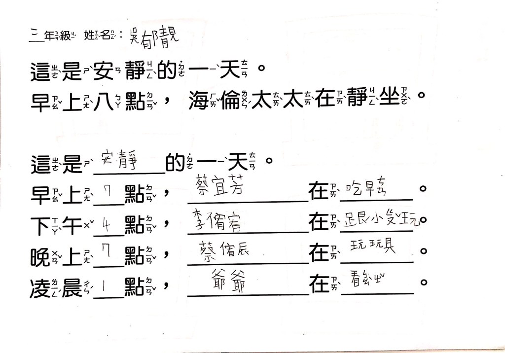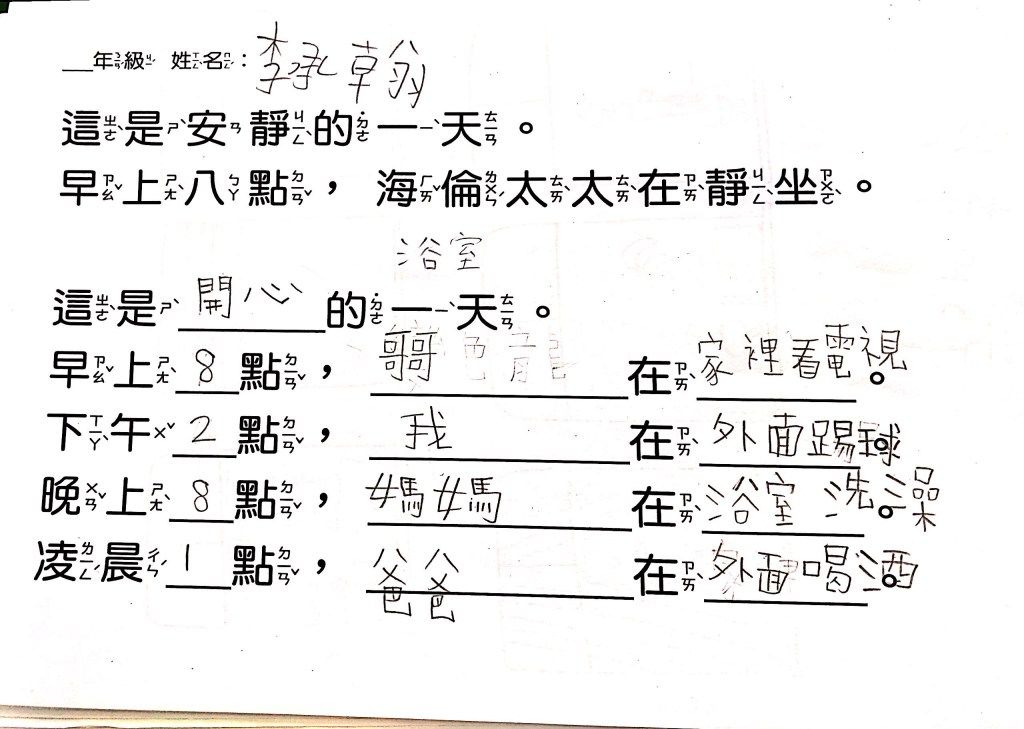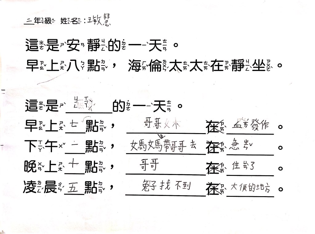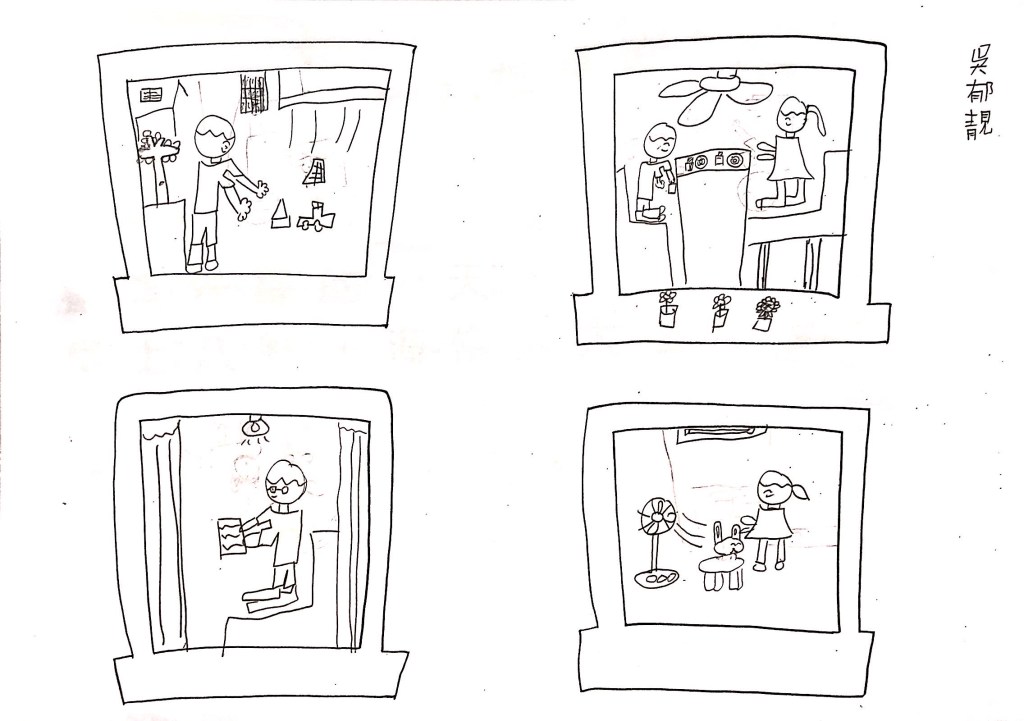 最後透過四扇、五扇、六扇窗,搭配簡單的句子,讓孩子以「這是OO的一天」為題,畫出安靜、生氣、辛苦、倒楣、快樂等情境。