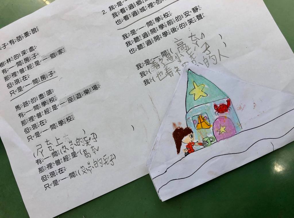 經典繪本《小房子》,從房子的視角,觀察周遭環境的變化,揣摩房子的心情;《開學了!學校也好緊張》,在學生熟悉的場域裡,換位思考和學校的互動,進一步詮釋「房子有話要說」;聆聽老師朗讀《樹林裡的房子》,在詩意的文字中,思考、討論什麼是「家」?