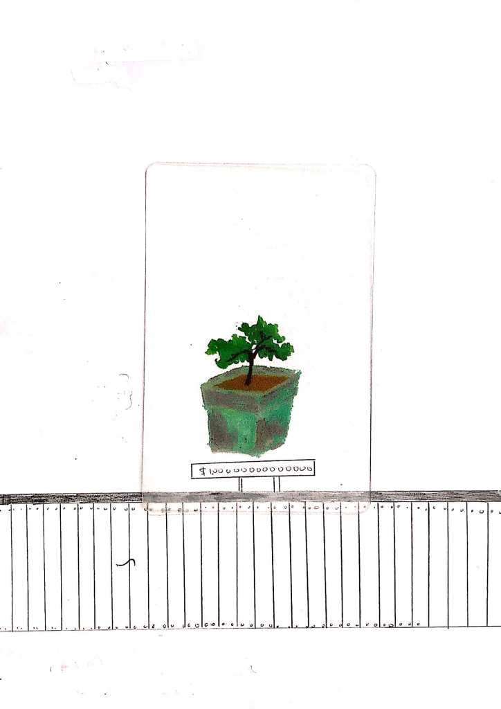 這幅畫很生動,我一看就笑出來。右邊大樹是媽媽,左邊的盆栽是女孩選的樹。