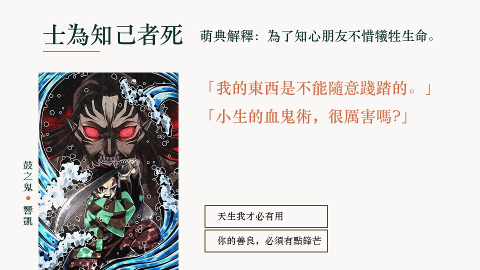 國中班課程「聯想成文」,邀請學生以一句慣用語入題,透過生活經驗的連結,在老生常談裡抒發新的體悟,或是翻轉經典名言的定義,感謝我鍾愛與嫌惡的鬼滅角色們,再次為我淋漓盡致的詮釋這堂課。