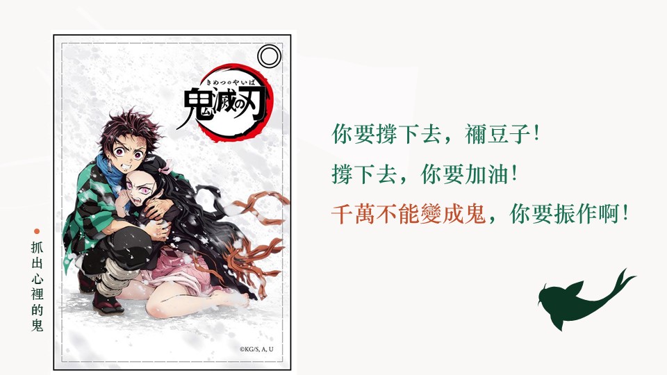 何潔心分析起「鬼滅」,彷佛進入哲學的思考,也進入了文學性的思考:「鬼是人的陰暗面。當人身陷谷底境遇、被負面能量包圍,或感到絕望的時候,鬼就會現身。」