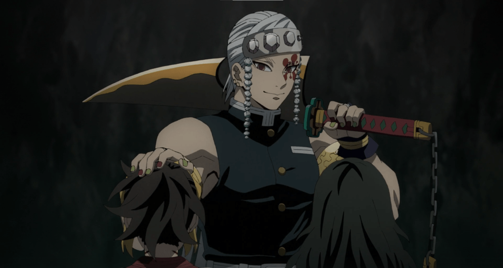 大混戰最後,為斷臂的炭治郎握刀;聽見隱宣告炭治郎沒了呼吸,義勇絕望的神情令人心碎。