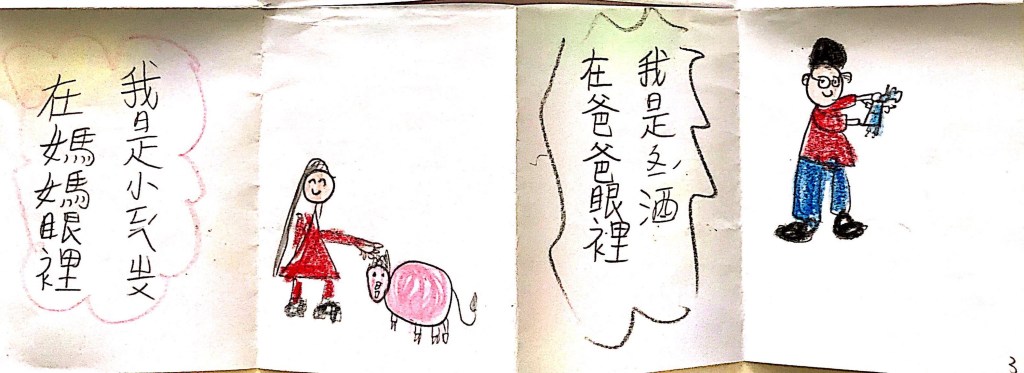 媽媽覺得我很乖,因為我每天都幫忙摺衣服。爸爸覺得我很孝順,因為我每天都幫爸爸槌背。姐姐覺得我很頑皮,因為我每天都跟她打架。