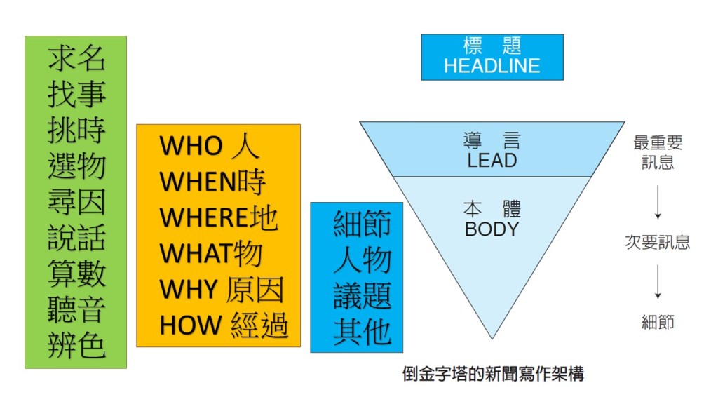 標題需要摘取「關鍵字」的能力,提高吸睛效果的文字創意。導言需要「剪裁」的略寫技巧,言簡意賅的整理新聞的「人事時地物」(報導常見的順序是「時地事人物」)。本文則需要「擴展」的詳寫功夫:導言省略的細節、人物背景的介紹、相關單位的採訪與議題討論,都是本文能發展的內容。