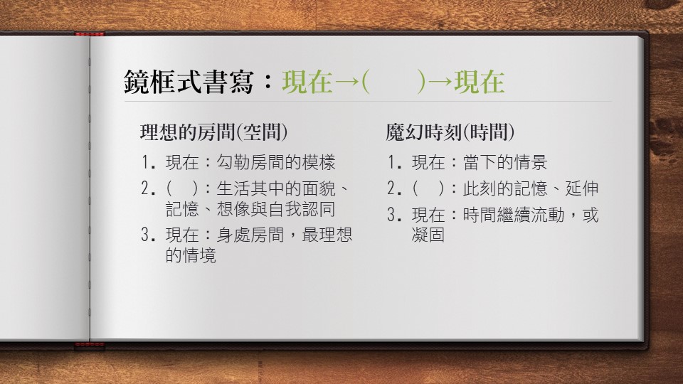 鏡框式結構是一種定位書寫,以「現在-過去-現在」或「現在-未來-現在」為敘述的時間軸,過去代表記憶,未來代表想像,不論書寫的時間拉得多廣多遠,都能在這個架構下,平安降落原點。運用在空間書寫的題目,也很適合。