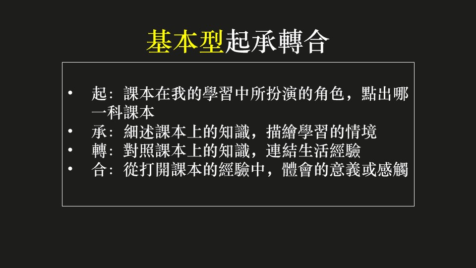 面對有時間限制的作文考試和比賽、或是有結構需求的作業時,套用基本的起承轉合框架來幫忙檢視,是紮實又有效率的方法。
