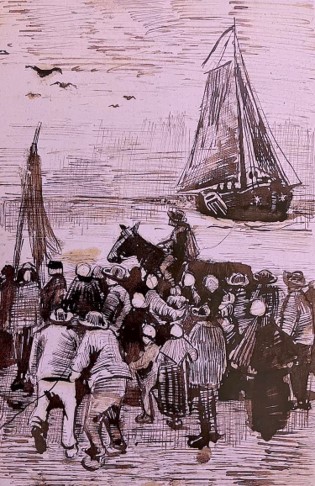 畫作是他在荷蘭的海濱勝地斯赫弗寧恩,看著漁船入港時,將現場的各式景緻描繪下來的景象,他用文字如此描述: