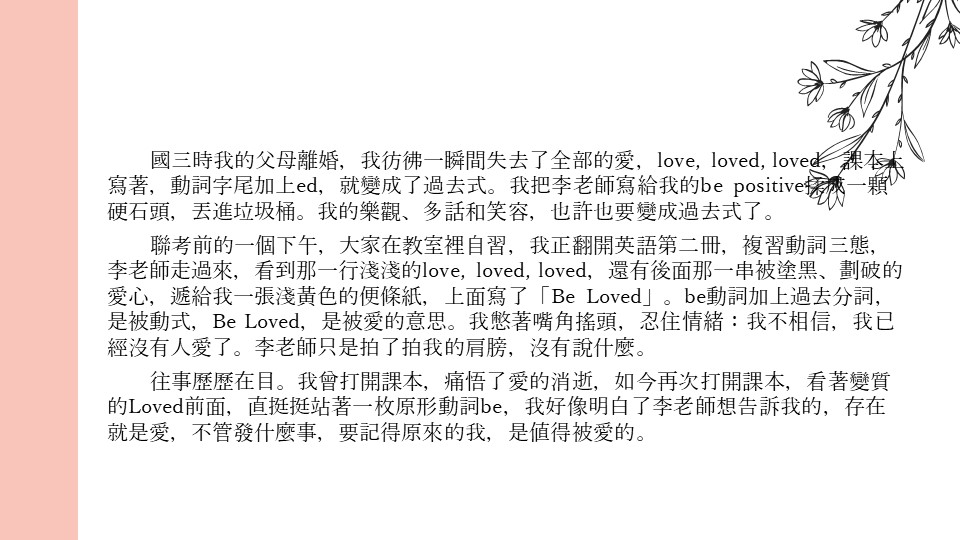 眼前這個二十多歲的年輕人,是教授多年前輔導過的孩子。教授拿出一本英文課本,請他翻開第21頁:be 動詞的過去式,這是當年學生不告而別之前,教授為他上的最後一課。